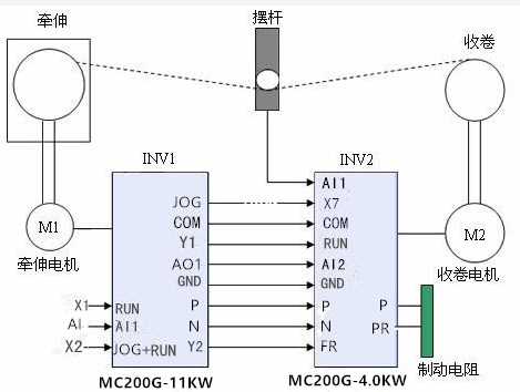 牽伸電機(jī)采用MC200G0110T4型變頻器,收卷電機(jī)采用MC200G0040T4型卷繞專(zhuān)用型變頻器(外配制動(dòng)電阻)以主機(jī)INV1的運(yùn)轉(zhuǎn)指令及輸出頻率信號(hào)作為從機(jī)INV2的運(yùn)行指令及頻率指令實(shí)現(xiàn)同步運(yùn)行停車(chē)時(shí),對(duì)于重量較大的滿(mǎn)盤(pán)以反方向制動(dòng)防止因慣性引起的斷線 以JOG功能實(shí)現(xiàn)穿線作業(yè)時(shí)的點(diǎn)動(dòng)功能 以擺桿輸出電壓信號(hào)作為反饋信號(hào)進(jìn)行內(nèi)部可變PID補(bǔ)正控制,以寶米勒變頻器獨(dú)特卷繞曲線進(jìn)行速度預(yù)測(cè)圖形運(yùn)轉(zhuǎn),實(shí)現(xiàn)恒線速度收卷,滿(mǎn)足工藝要求。 以擺桿輸出電壓信號(hào)作為反饋信號(hào)進(jìn)行內(nèi)部可變PID補(bǔ)正控制,以寶米勒變頻器獨(dú)特卷繞曲線進(jìn)行速度預(yù)測(cè)圖形運(yùn)轉(zhuǎn),實(shí)現(xiàn)恒線速度收卷,滿(mǎn)足工藝要求。 系統(tǒng)電氣控制示意圖如下: