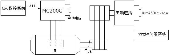 事實證實采用MC200G系列高性能矢量變頻器完全能夠滿足機床主軸控制的要求。MC200G采用的領(lǐng)先的磁通算法,即使在低轉(zhuǎn)速(低頻)運行下也能平穩(wěn)輸出150%的轉(zhuǎn)矩,以滿足不同零件的加工需要,完全可以取代傳統(tǒng)的轉(zhuǎn)動軸承主軸結(jié)構(gòu),并且此主軸結(jié)構(gòu)簡單、緊湊、可以實現(xiàn)真正的無級調(diào)速。此主軸的轉(zhuǎn)速由外部模擬量信號來控制輸出頻率,在不同的加工工藝(如;粗加工、精加工等)需要不同的轉(zhuǎn)速,此時可由數(shù)控系統(tǒng)輸出不同的模擬量電壓信號給變頻器,實現(xiàn)不同的轉(zhuǎn)速,同時啟停信號也由數(shù)控系統(tǒng)控制,進步了自動化程度、延長了刀具的使用壽命。