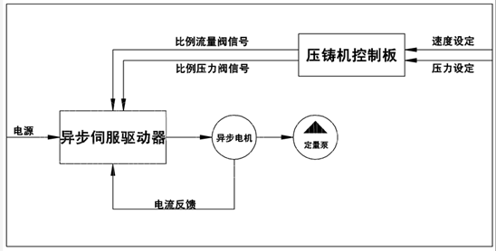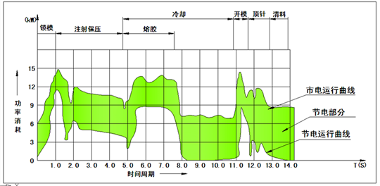 注塑機(jī)的用電主要消耗在油泵電機(jī)上,所以降低油泵電機(jī)的用量是注塑機(jī)節(jié)能的關(guān)鍵。在定量泵的液壓系統(tǒng)中,電機(jī)以50Hz高速運(yùn)轉(zhuǎn),油泵的供油量是基本不變的,遠(yuǎn)遠(yuǎn)大于注塑機(jī)工況的實(shí)際流量需求,多余的高壓油經(jīng)溢流閥全部回流至油箱,能量存在巨大的浪費(fèi)。而油泵的供油量與電機(jī)的轉(zhuǎn)速成正比,因此我們可以通過(guò)降低電機(jī)的轉(zhuǎn)速,使油泵的供油量與注塑機(jī)的實(shí)際流量需求相一致,冷卻時(shí)電機(jī)可以停下來(lái),幾乎消除溢流現(xiàn)象。