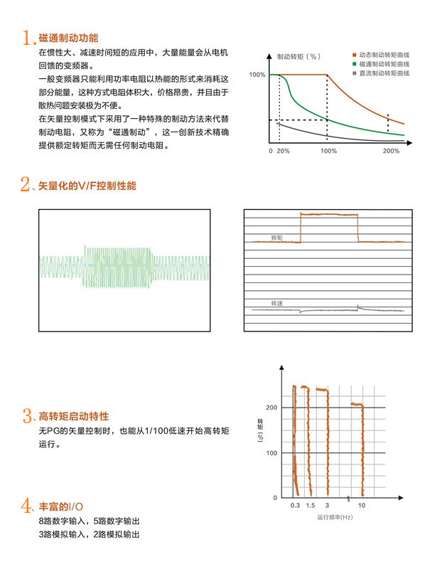 無(wú)速度傳感器矢量控制:130%/0.5Hz |