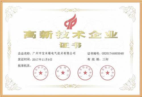 近日,廣州市寶米勒電氣技術(shù)有限收到由廣東省科學技術(shù)廳、廣東省財政廳、廣東省國家稅務局、廣東省地方稅務局聯(lián)合頒發(fā)的《高新技術(shù)企業(yè)證書》,由此正式邁入國家高新技術(shù)企業(yè)行列。