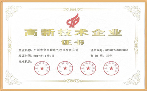 廣州市寶米勒電氣技術有限收到由廣東省科學技術廳、廣東省財政廳、廣東省國家稅務局、廣東省地方稅務局聯(lián)合頒發(fā)的《高新技術企業(yè)證書》,由此正式邁入國家高新技術企業(yè)行列。
