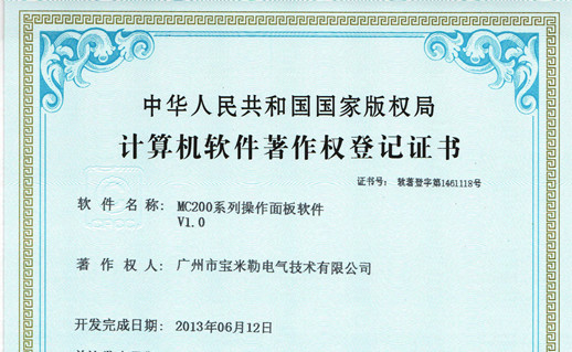 經(jīng)中華人民共和國國家版權局考證,根據(jù)《中華人民共和國計算機軟件保護條例》和《計算機軟件著作權登記辦法》的規(guī)定,廣州市寶米勒電氣技術有限公司取得了計算機軟件著作權登記證書3項。截止目前,公司已取得9項計算機軟件著作權