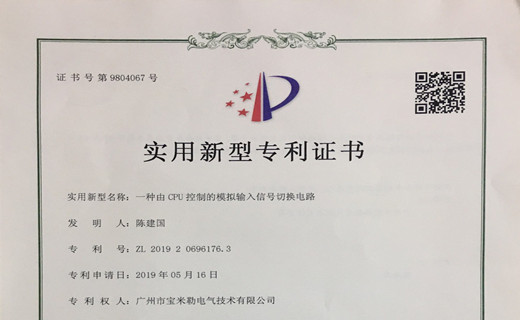 廣州市寶米勒電氣技術有限公司收到了由國家知識產(chǎn)權局頒發(fā)的三項實用新型專利證書。這三項實用新型既是我司研發(fā)人員心血凝聚的結晶,也是公司科研創(chuàng)新實力的展示,在提升了公司的核心競爭力的同時,也在一定程度上有利于發(fā)揮我司的自主知識產(chǎn)權優(yōu)勢,對公司的持續(xù)發(fā)展和品牌樹立有著重要的作用,標志著我公司在創(chuàng)新發(fā)展的道路上又邁出了堅實的一步.