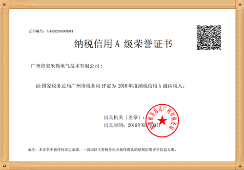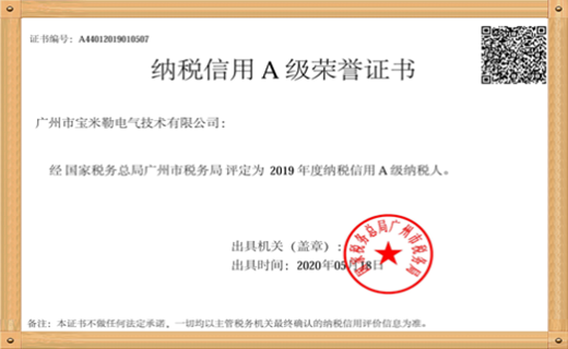 繼2017年獲得納稅A級榮譽證書后,2018年廣州市寶米勒電氣技術有限公司憑借誠信納稅的良好信譽,再次被廣州市國家稅務局、廣州市地方稅務局聯(lián)合評定為2018年度納稅信用A級企業(yè),榮獲《納稅信用A級榮譽證書》! 未來,寶米勒將繼續(xù)保持良好的作風,在此相關工作中砥礪前行,爭取獲得更大的榮譽!